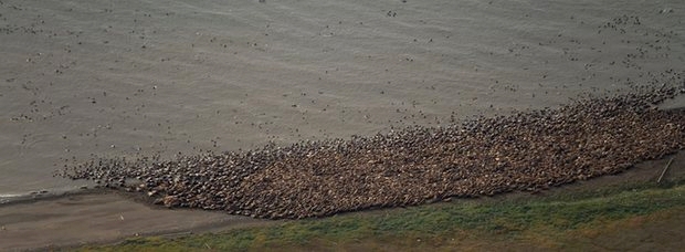 Featured image: Aerial photograph of thousands of pacific walrus coming ashore near point lay on the north west arctic coast of Alaska, Photo: Gary Braasch/Corbis
